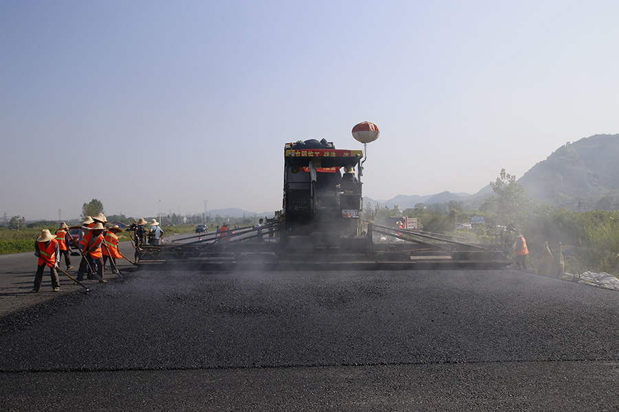 2019年8月,宜春經(jīng)開(kāi)區(qū)S311路面攤鋪現(xiàn)場(chǎng),工友們輔助路面兩側(cè)的分料、補(bǔ)窩等作業(yè)